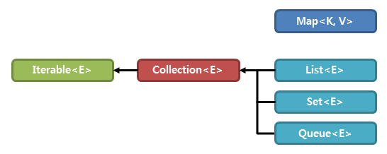 위의 그림에서 <E>나 <K, V>라는 것은 컬렉션 프레임워크를 구성하는 모든 클래스가 제네릭으로 표현되어 있음을 알려줍니다.